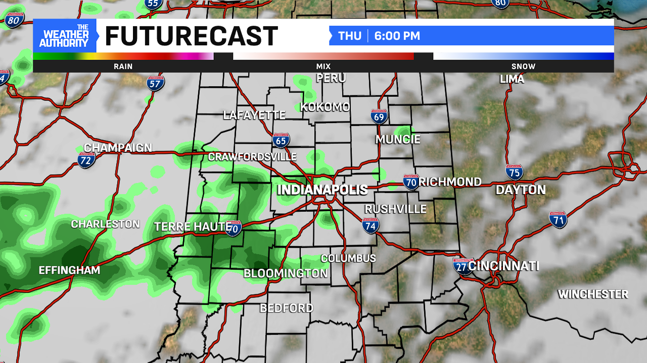 A low pressure system parked over Richmond, Indiana kept skies cloudy and brought widely scattered showers to central Indiana Wednesday. A few sprinkles will fall this evening and patchy fog will develop across the state after Midnight. Temperatures will stay mild this evening and overnight as lows fall into mid to upper 50s.