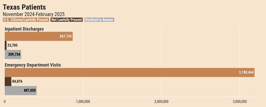 Hospitals in Texas are required to ask each patient their immigration status, but patients are not required to answer. In the first four months of data collection, almost 617,000 patients — 12.9% — declined to answer the question.