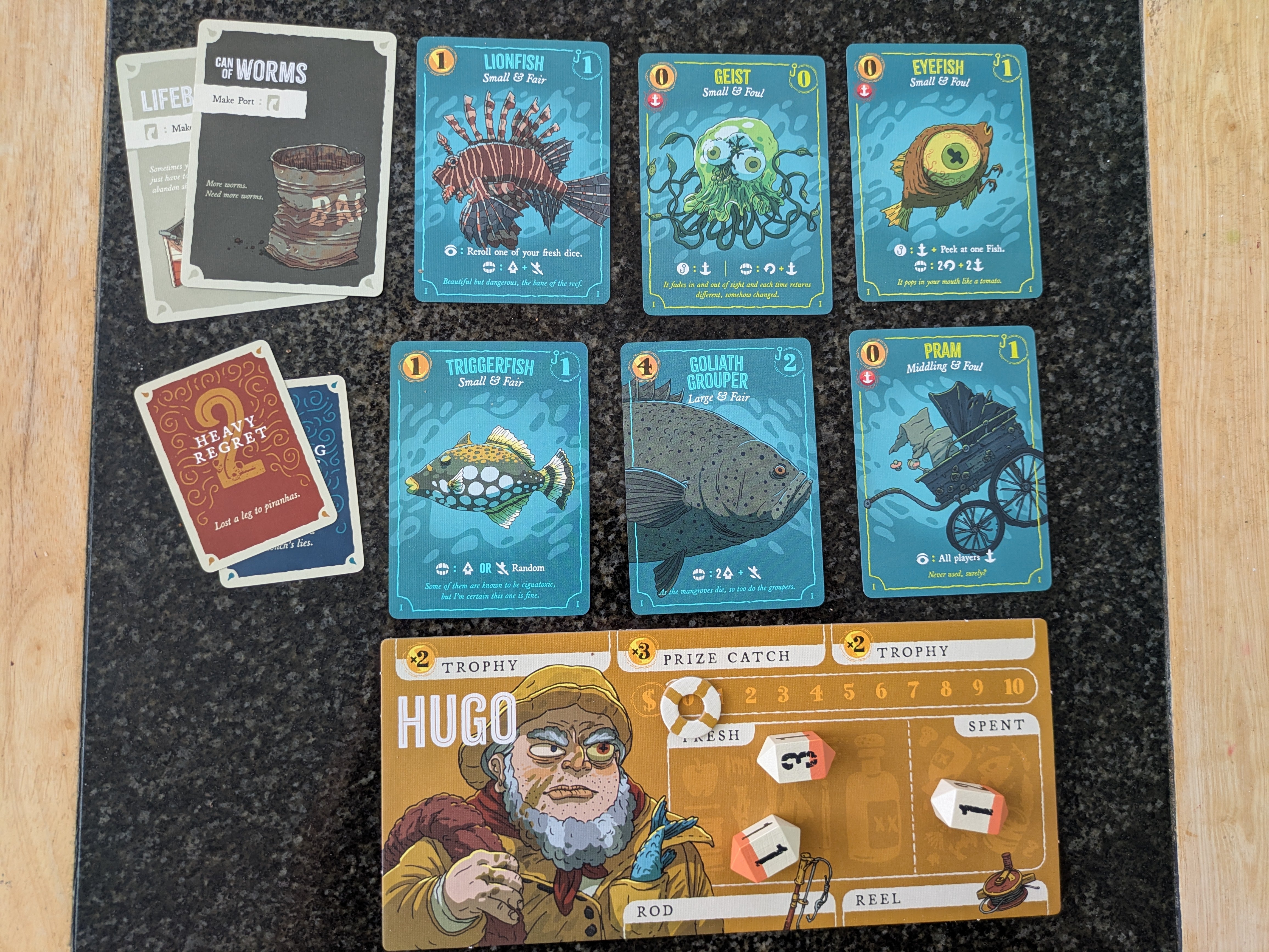 Much of the weight comes from various decks of cards. There are three decks of fish, one for each depth, plus a deck of “dinks,” tiny fish you can gain if your main catch gets away. There are also decks of rods, reels and “supply” that you can buy at port. The biggest deck of all is the deck of regrets which you pick up for undertaking regrettable actions at sea. There’s also a cloth bag of custom dice shaped like fishing floats, various chunky wooden tokens and a metal “fish coin” used to flip and resolve some card effects. Finally there’s a paper pad for tracking your catches in the solo variant.