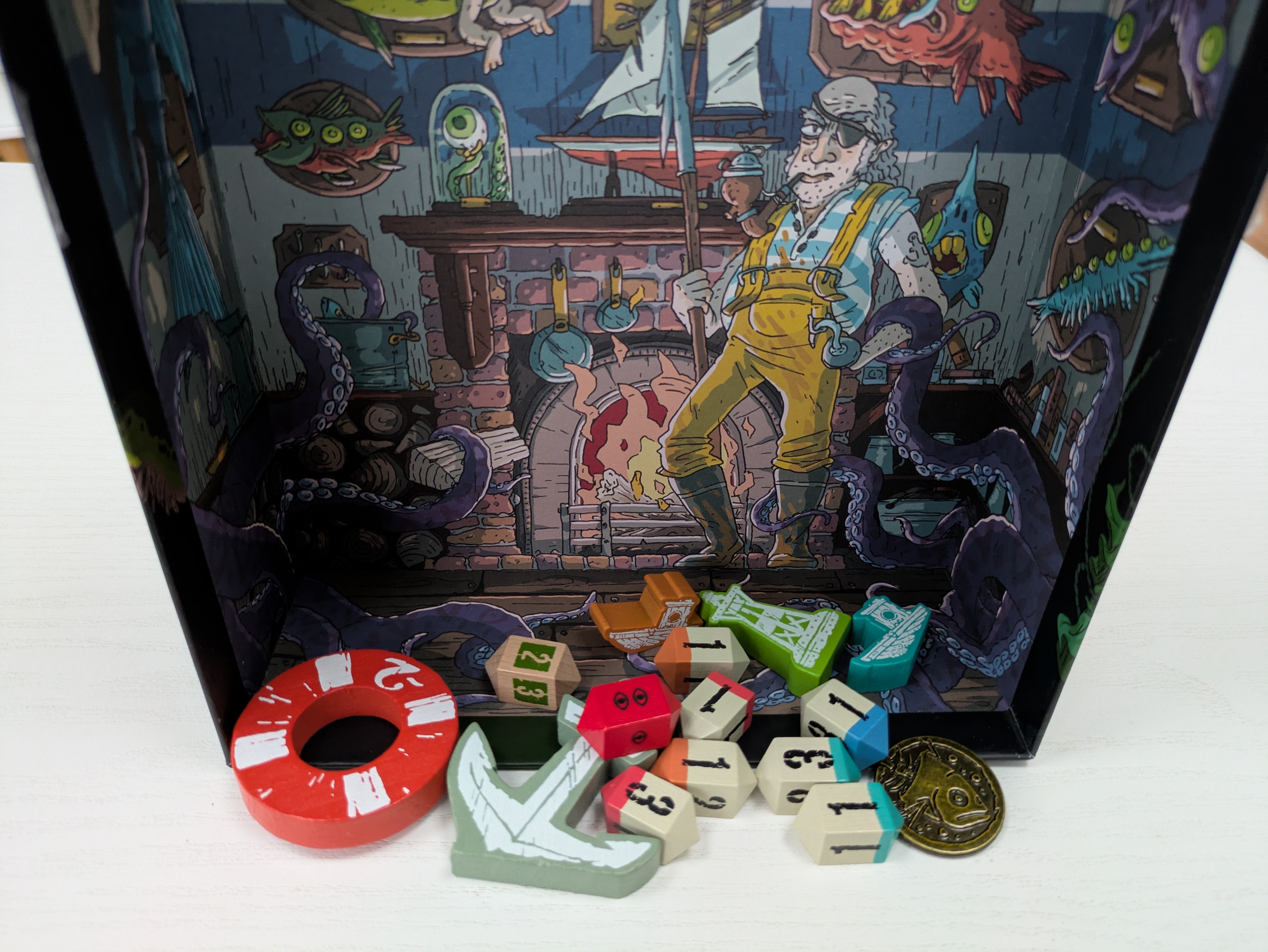 It’s hard to overstate just how evocative the visual design of the game is. Everything is decorated with art by the game’s designer, even the inside of the box lid. He’s a talented artist, creating detailed, imaginative visuals that strike a pitch-perfect stylistic balance between fun and creepy. Once you start flipping the fish cards, the chance to see new ones, or re-examining familiar ones for details that you missed becomes a major draw to replay the game alongside the fun of dice-rolling and decision-making.