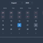 mode(string): Sets the selection mode. Can be'single','range', or'multiple'. Default:'single'.format(string): Defines the date format string used for the input field’s value. Default:'Y-m-d'.locale(string): Sets the language for month and day names. Default:'en'.defaultDate(Date|string): Sets the initial selected date when the picker is created. Default:null.inline(boolean): Iftrue, the calendar is displayed directly in the page layout instead of as a popup. Default:false.theme(string): Sets the visual theme. Options are'default','dark', and'minimal'. Default:'default'.minDate(Date|string): The earliest selectable date. Default:null.maxDate(Date|string): The latest selectable date. Default:null.disabledDates(Array): An array of specific date strings (e.g.,'2025-12-25') to disable. Default:[].disabledDaysOfWeek(Array): An array of weekday numbers (0 for Sunday, 6 for Saturday) to disable. Default:[].disabledDateRanges(Array): An array of date range objects (e.g.,{start: '2025-08-01', end: '2025-08-10'}) to disable. Default:[].enabledDates(Array): Acts as a “whitelist.” If set, only dates in this array are selectable. Default:[].disableWeekends(boolean): A shortcut for disabling Saturdays and Sundays. Default:false.blockPastDates(boolean): Blocks all dates before today. Default:false.blockFutureDates(boolean): Blocks all dates after today. Default:false.disableFunction(Function): A custom function that receives a date object and returnstrueto disable it. Default:null.showIcon(boolean): Toggles the visibility of the calendar icon next to the input. Default:true.iconPosition(string): Sets the icon position to either'left'or'right'. Default:'right'.customIcon(string): Allows you to provide your own custom HTML or SVG for the icon. Default:null.iconClass(string): A custom CSS class to apply to the icon element. Default:'datepicker-icon'.iconClickOpens(boolean): Iftrue, clicking the icon opens the date picker. Default:true.position(string): Sets the popup position relative to the input. Can be'auto','above', or'below'. Default:'auto'.firstDayOfWeek(number): Sets the first day of the week (0 for Sunday, 1 for Monday, etc.). Default:0.closeOnSelect(boolean): Iftrue, the calendar closes immediately after a date is selected. Default:true.allowInput(boolean): Iftrue, allows users to type a date directly into the input field. Default:true.clickOpens(boolean): Iftrue, clicking the input field opens the date picker. Default:true.confirmRange(boolean): Inrangemode, this adds “Apply” and “Cancel” buttons to confirm the selection. Default:false.applyButtonText(string): The text for the “Apply” button whenconfirmRangeis enabled. Default:'Apply'.cancelButtonText(string): The text for the “Cancel” button whenconfirmRangeis enabled. Default:'Cancel'.enableTime(boolean): Adds a time selector to the calendar. Default:false.enableSeconds(boolean): Shows the seconds input in the time selector. Default:false.time_24hr(boolean): Iftrue, uses a 24-hour time format instead of AM/PM. Default:true.enableMonthDropdown(boolean): Toggles the month selection dropdown in the calendar header. Default:true.enableYearDropdown(boolean): Toggles the year selection dropdown in the calendar header. Default:true.yearRange(number): Sets the number of years to display before and after the current year in the dropdown. Default:100.minYear(number): Sets an absolute minimum year for the year dropdown. Default:null.maxYear(number): Sets an absolute maximum year for the year dropdown. Default:null.