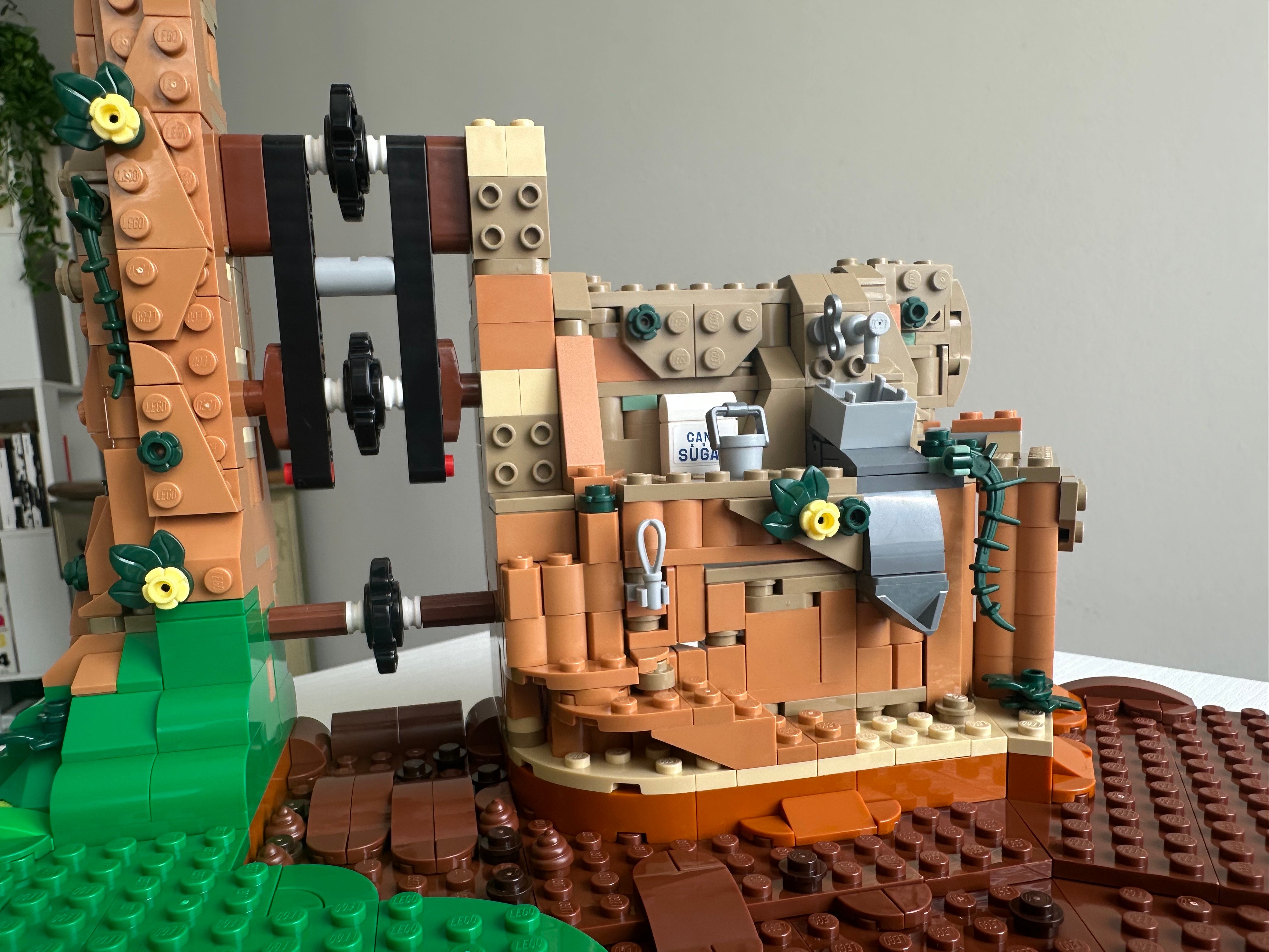 On the factory’s tiered front side, you’re building essentially the setting of the original Oompa Loompa song, complete with a pack of cane sugar and a pipe system you can imagine feeds milk into the river. Interestingly enough, the two Oompa Loompa minifigures are the only ones without leg hinges. This does make them shorter than the rest of the minifigs, but I found myself feeling sad that they couldn’t dance.
