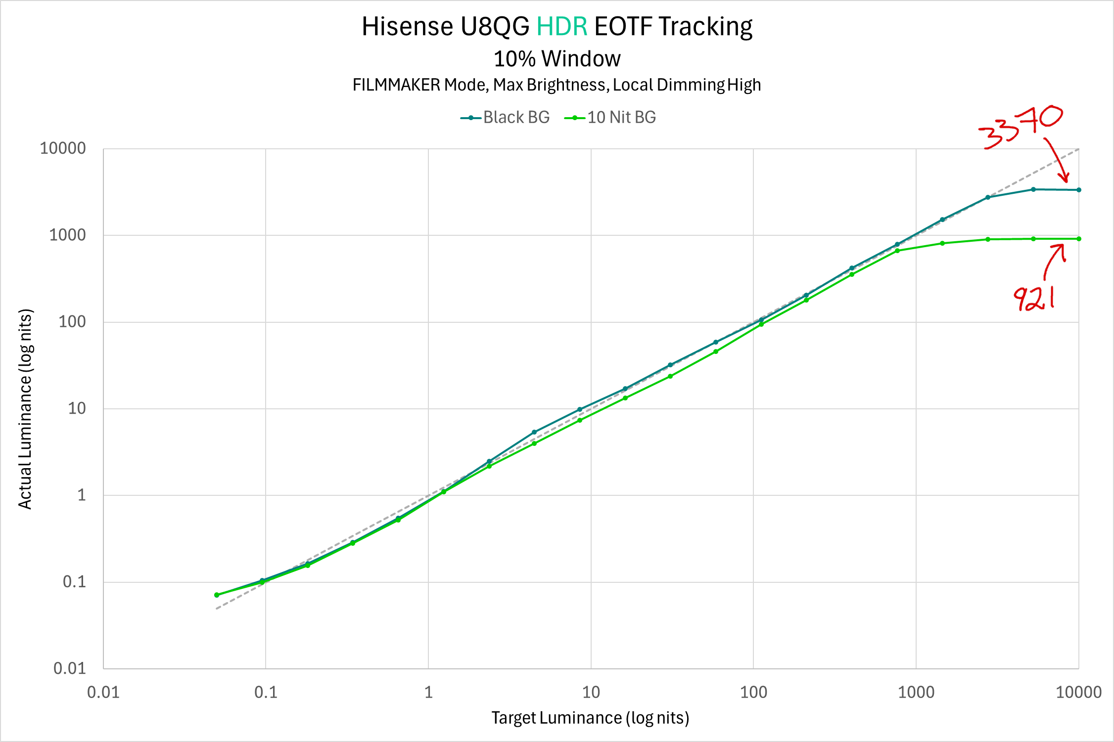 A different way to look at this behavior is to consider the EOTF tracking of the display while in HDR. An ideal display would perfectly track the reference line, i.e. if the HDR signal says to present 1 nit or 4 nits or 4000 nits, the display would do exactly that. Most real TVs can’t reach 10000 nits, though, so manufacturers opt to either roll off highlights early in the hopes of maintaining some gradation at the brightest levels or they simply clip any signal above the max brightness of the display. The exact shape of the brightness rolloff is less important than it may seem because it’s very difficult for us humans to see any real distinction between, for example, 3100 nits and 3200 nits in a highlight.