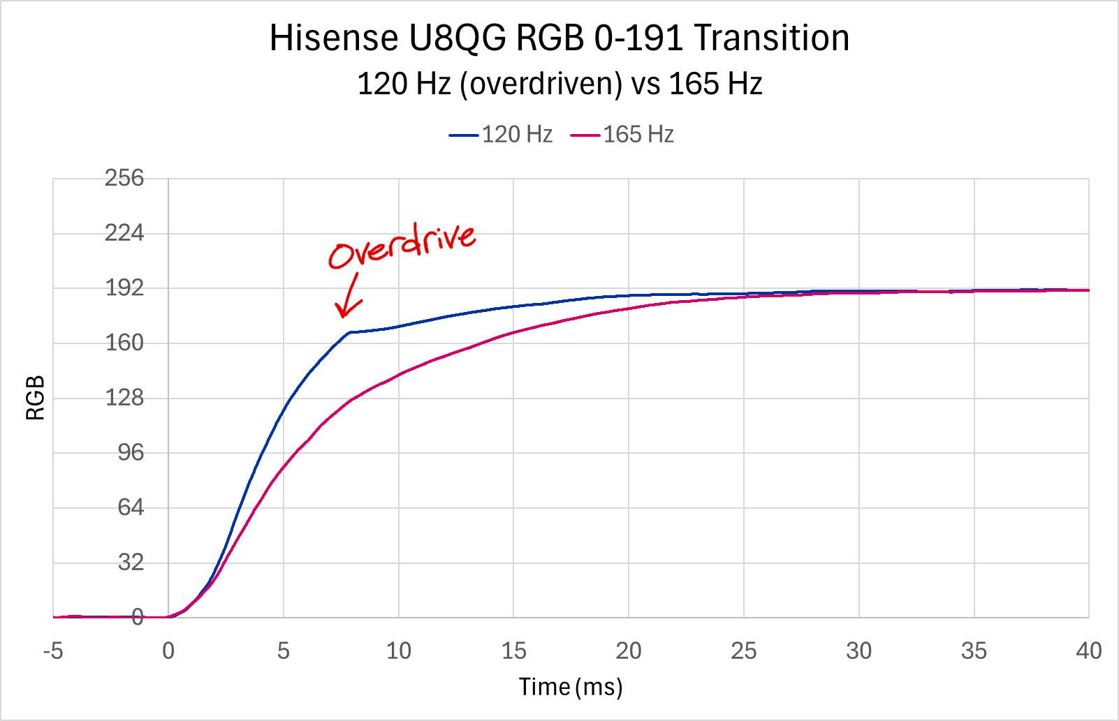 Hisense attempted to mitigate this VA weakness by tuning their pixel overdrive, but oddly, they only did this for the 120 Hz mode (or 120 fps in VRR). The graph below shows just one example of how they improved the overall average RT performance down to only 14.3 ms, comparing the black to gray (RGB 0 to 191) transition at 120 Hz with the “faster” 165 Hz mode: