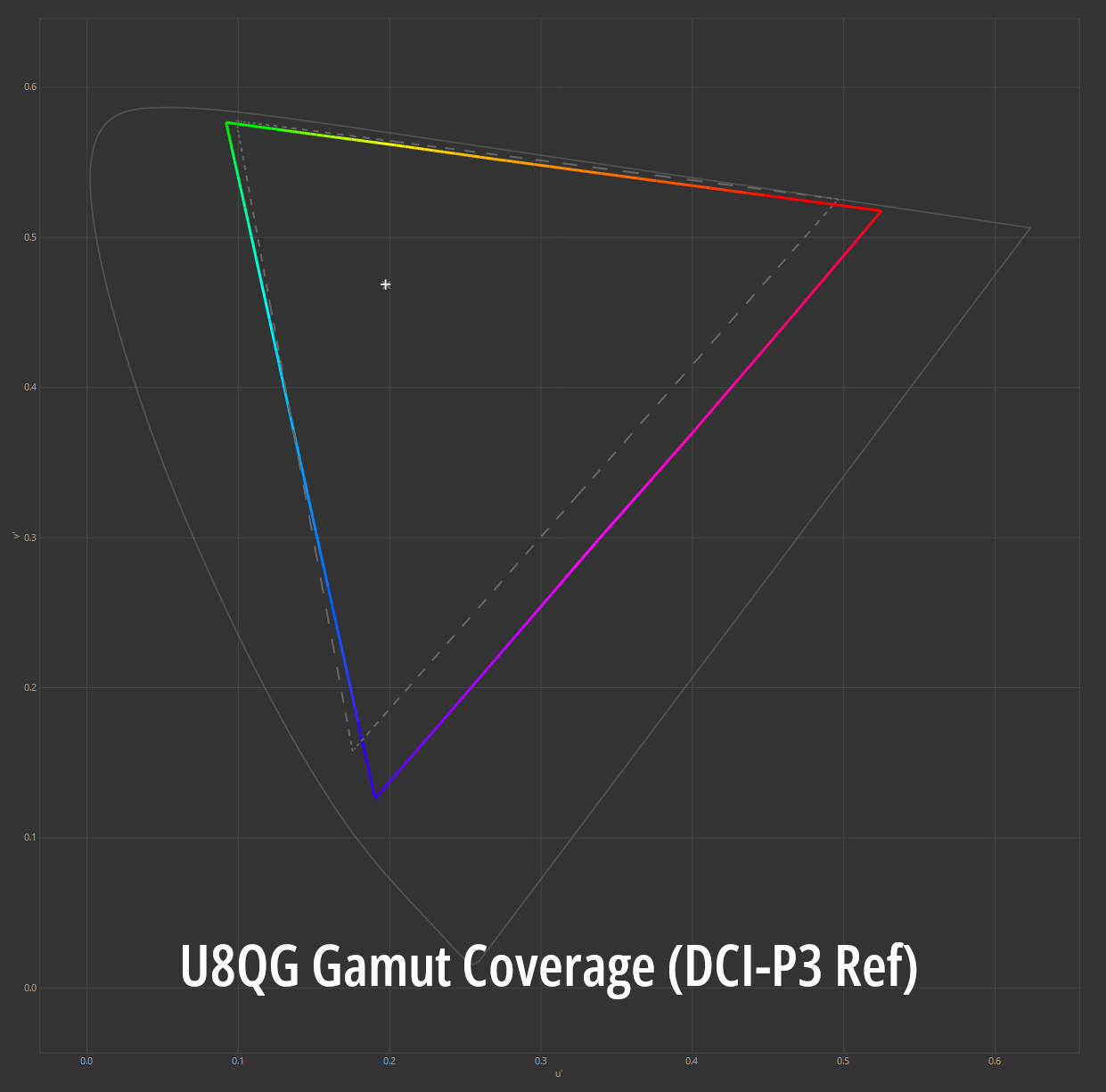 With just a small tweak to the 2-point white balance calibration (I used -1 for R and G gain, no other modifications), the U8QG has near-perfect 6500K white balance tracking, and the gamma conforms nicely to BT.1886.