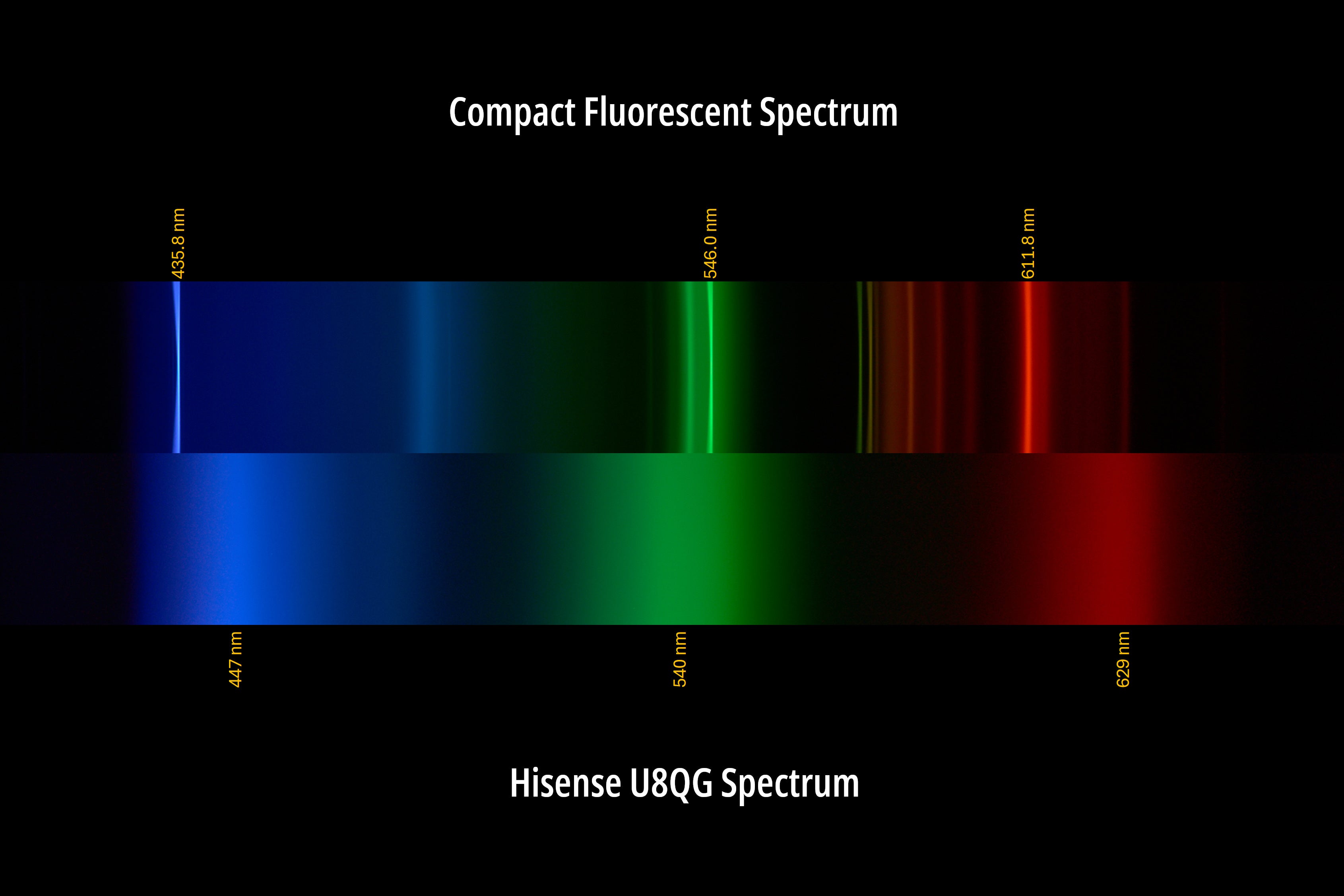 The U8QG has exceptionally vivid colors, and taking a look at its backlight spectrum gives us a peak at how that was done. Hisense uses quantum dots in their U series, which produce smooth and distinct RGB primaries. The red (peaking at 629 nm) and blue (at 447 nm) are doing the lion’s share of work to push the gamut well beyond the P3 color space.