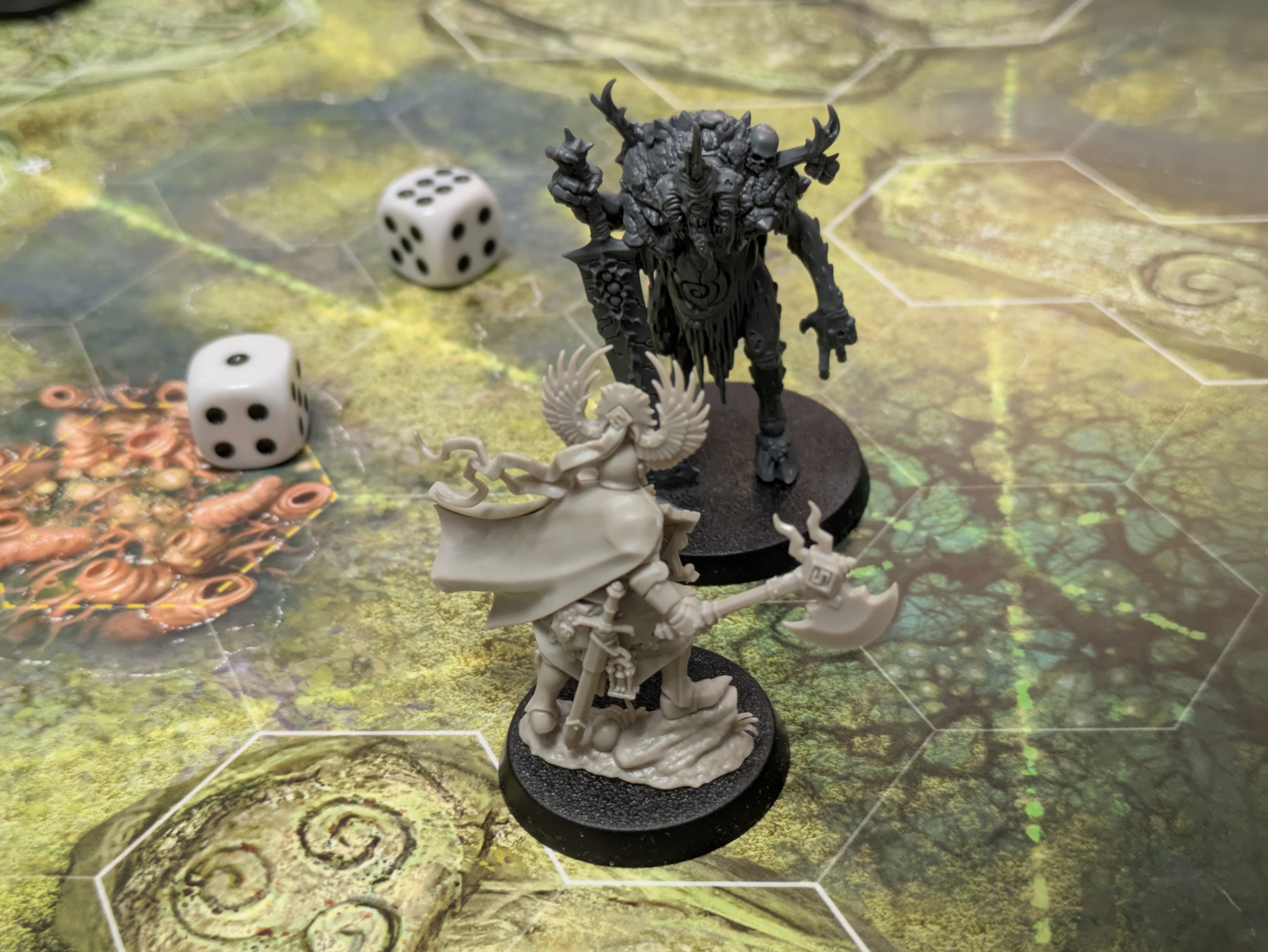 Between each hero’s turn, the monsters get to activate. How they behave depends on a dice roll, and most enemies switch between a sedate black die and a more threatening red die with each passing battle round. Mostly they’ll move toward a target at variable speed and try to attack, although all the monsters also have a special effect: horrible little pox-wretches spawn new companions, while the tough daemonic cankerborn blast all nearby heroes with an area effect attack. This roll can have a major impact on the difficulty of a scenario, as monsters sometimes do nothing and sometimes unleash a terrifying onslaught, a quirk that the rules put down to their chaotic nature.