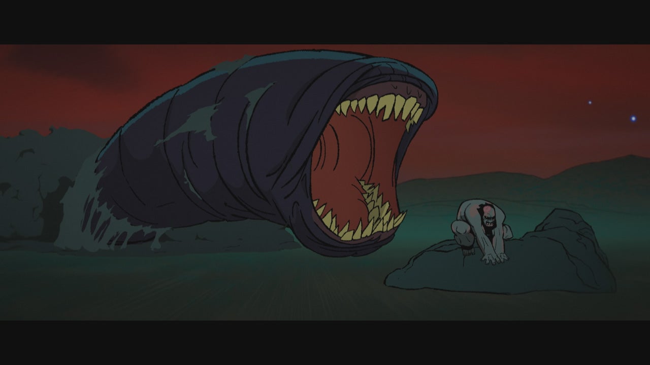 Back in reality, he falls into a chasm filled with prickly vines, but is impervious to injury now (or rather, just doesn’t care if his flesh is damaged). He escapes, only to come face to face with the worm again. The humongous thing appears from underground right beneath Spear and seems to have finally caught its prey. With Spear in the creature’s mouth, he manages to hold its jaws open and jump down to the ground. But then, the worm suddenly falls hard onto Spear, like a hammer hitting a nail… And cut to the Primal title card!