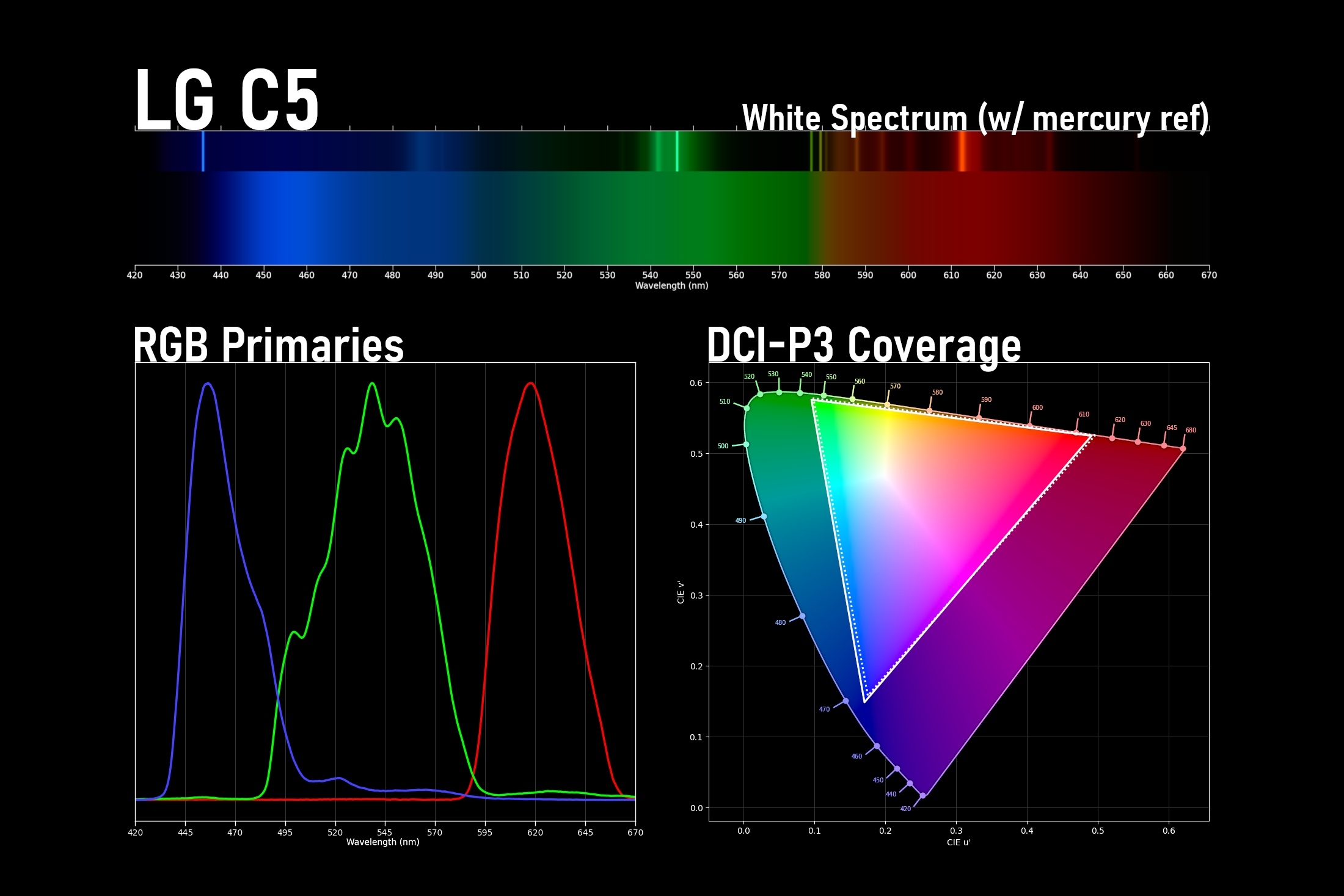 The image above shows the difference; the spectrum at the top next to the mercury reference shows the C5’s white output, which is quite different from the RGB primaries below. The wavelength and purity (or separation) of the RGB primaries is what gives the C5 excellent coverage of the DCI-P3 space, extending the points of its gamut triangle to nearly perfect alignment.