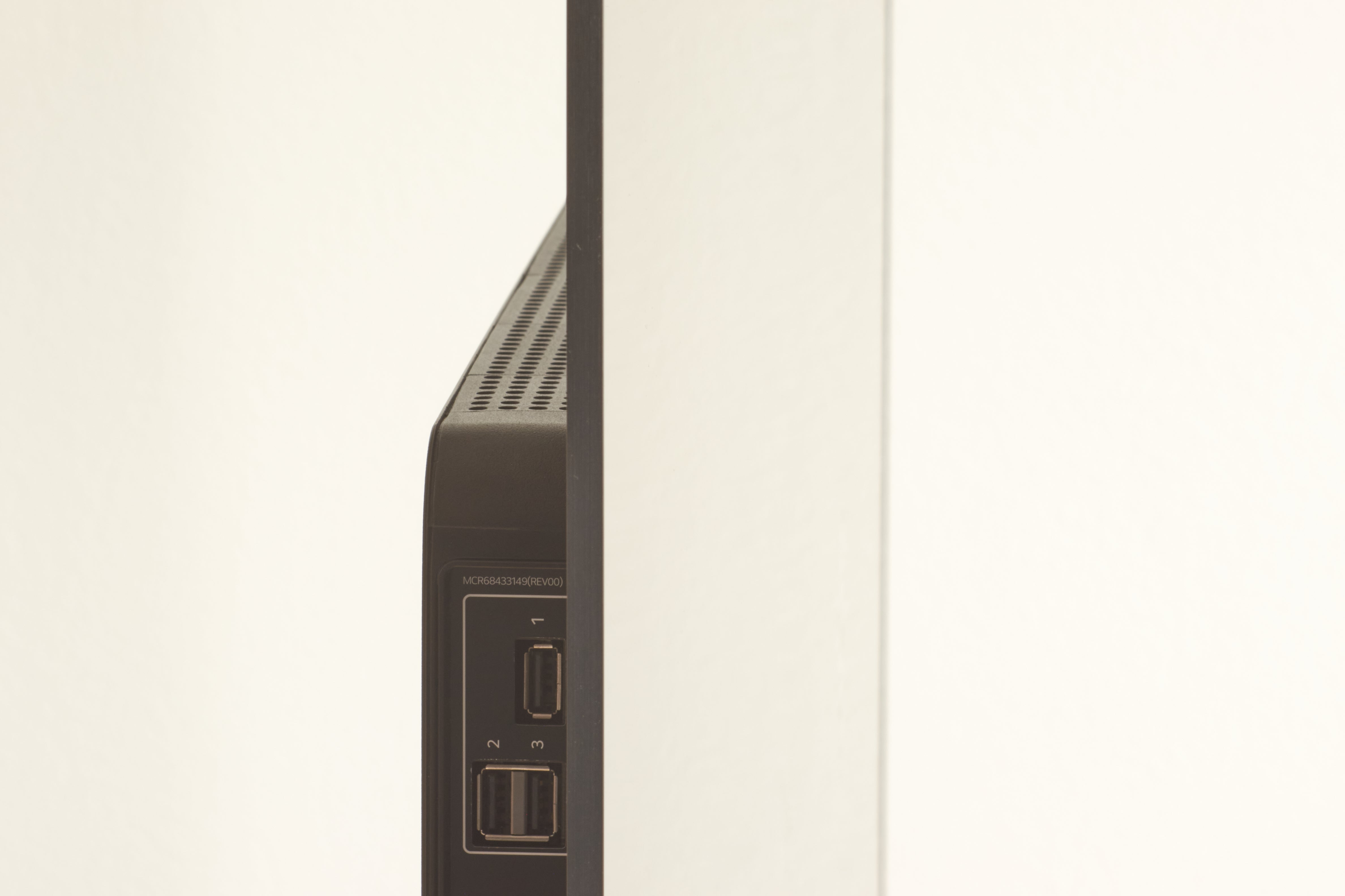 Whether on a TV stand or a deep desk, I really like the look of the C5. I received the 55″ version for review, and the brushed aluminum and faux marbling on the rear of the display works for me. And with the TV off, the glossy, purple-black screen looks like some sort of magical mirror. (More on that AR coating later.) LG keeps the outer, OLED portion of the display reasonably thick – 6 mm – so it doesn’t feel as delicate as Samsung’s S90F, which I thought would snap every time I touched it. The flimsy plastic cover plate and cable guide seem a bit out of place on the otherwise premium design. That plate also covers the permanently affixed power cable, an odd choice; other brands opt for a detachable cable.