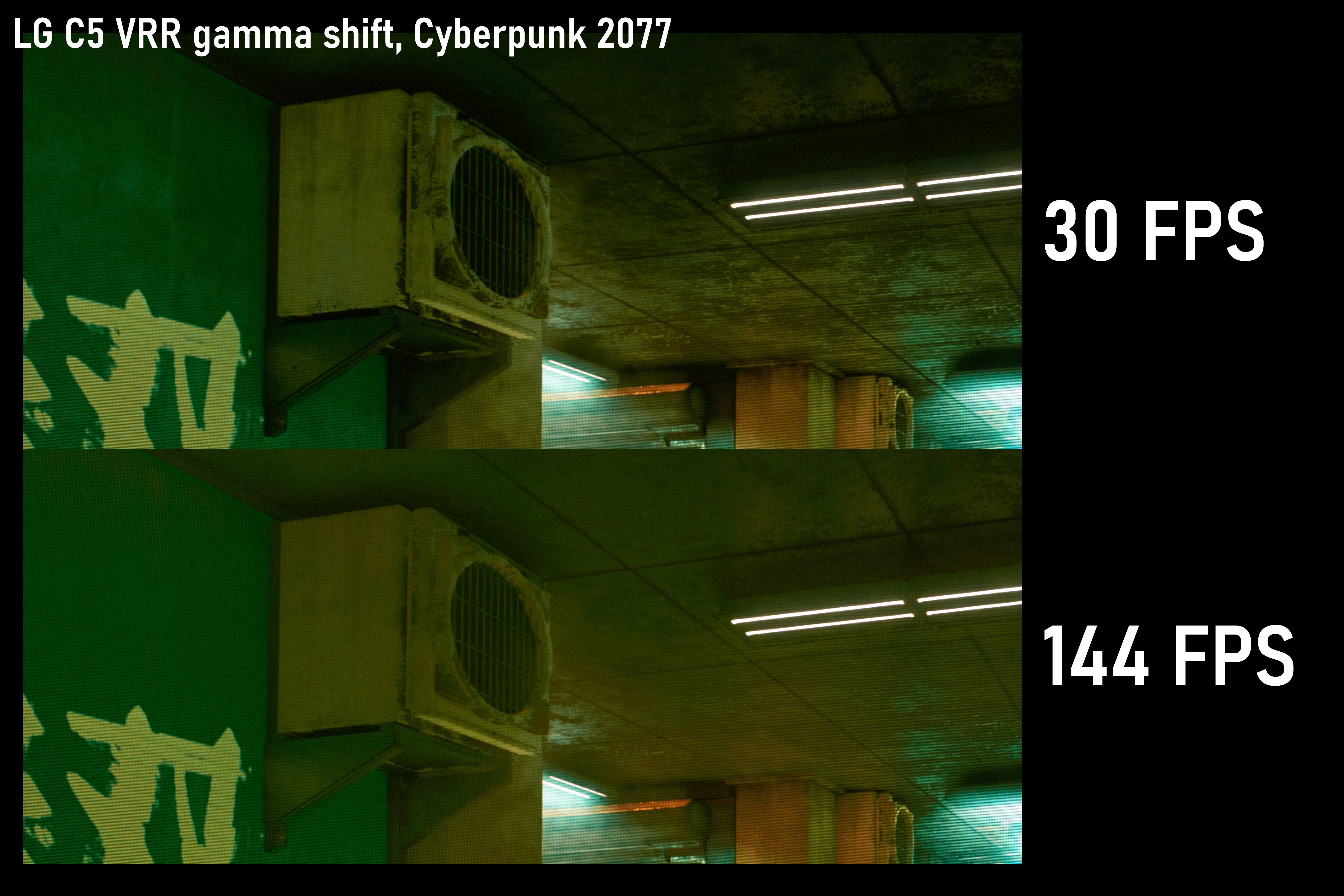 All OLED panels are susceptible to VRR flicker, and the C5 is no exception. Large and erratic frame time swings can cause the screen to rapidly brighten and darken; the cause seems to be a slightly different near-black gamma response at different framerates. The shot below compares a scene from Cyberpunk 2077 at 30 and 144 fps. Unless the screen is actively flickering, it’s pretty hard to notice this shift in real content; I chose this scene because it was particularly illustrative of the difference.