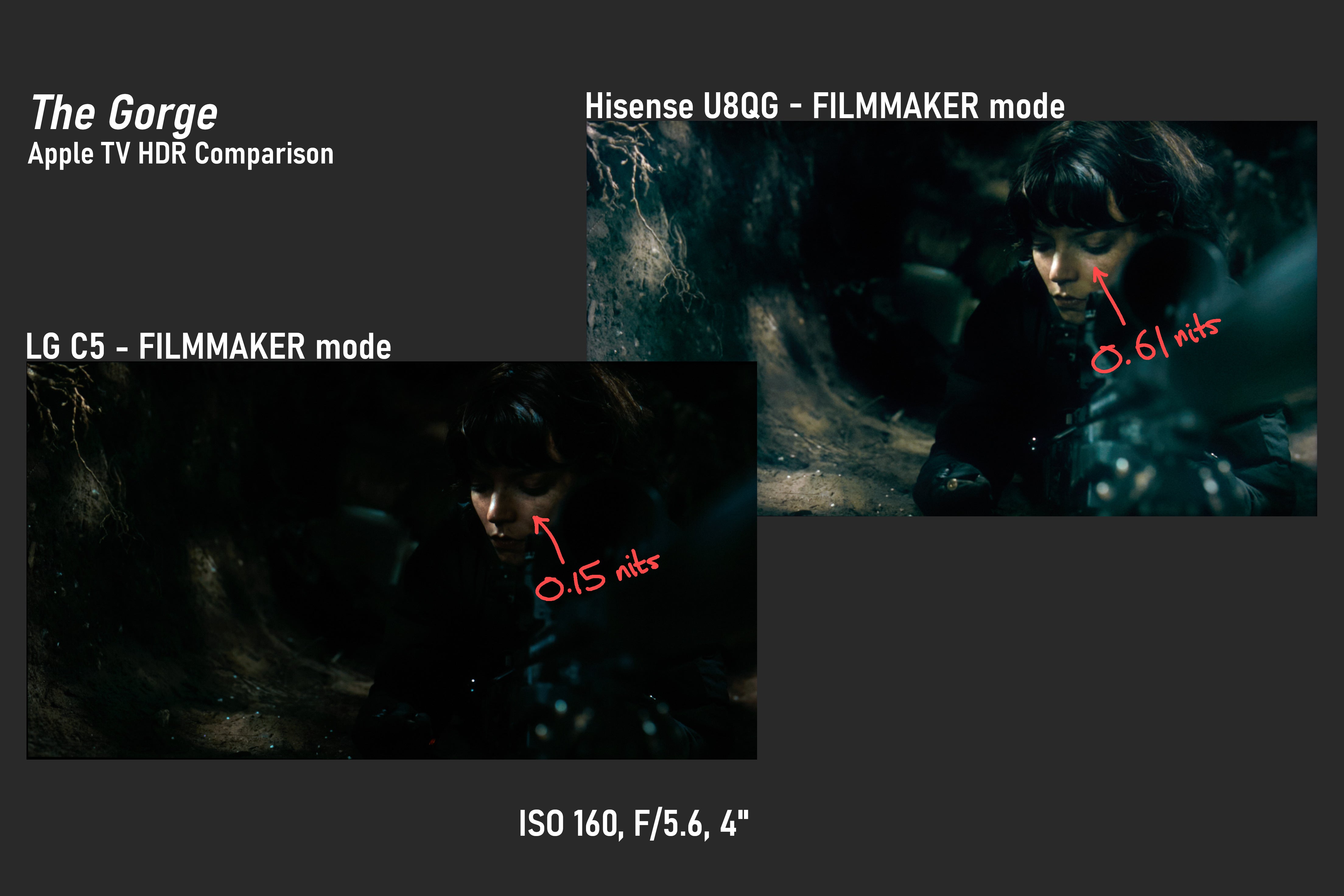 Perhaps this was intentional – a way to differentiate LG’s OLED offerings against LCD competition – but it causes real problems when gaming or watching movies. When watching The Gorge on Apple TV, at night with no room lights, I had trouble making out what was happening in almost every nighttime scene. I had a similar problem when rewatching Until Dawn on Netflix. It’s clear that no one would master content this way. Hisense’s U8QG does a much better job of accurate EOTF tracking; the scene above with Anya Taylor-Joy’s character crouched in a sniper position is intentionally dark, mostly below 1 nit, but detail is visible on the Hisense. On the C5, the frame is basically a floating face in a sea of black. LG does offer a “Dark Detail” adjustment, but even at its max of +3, tracking is still too dark.