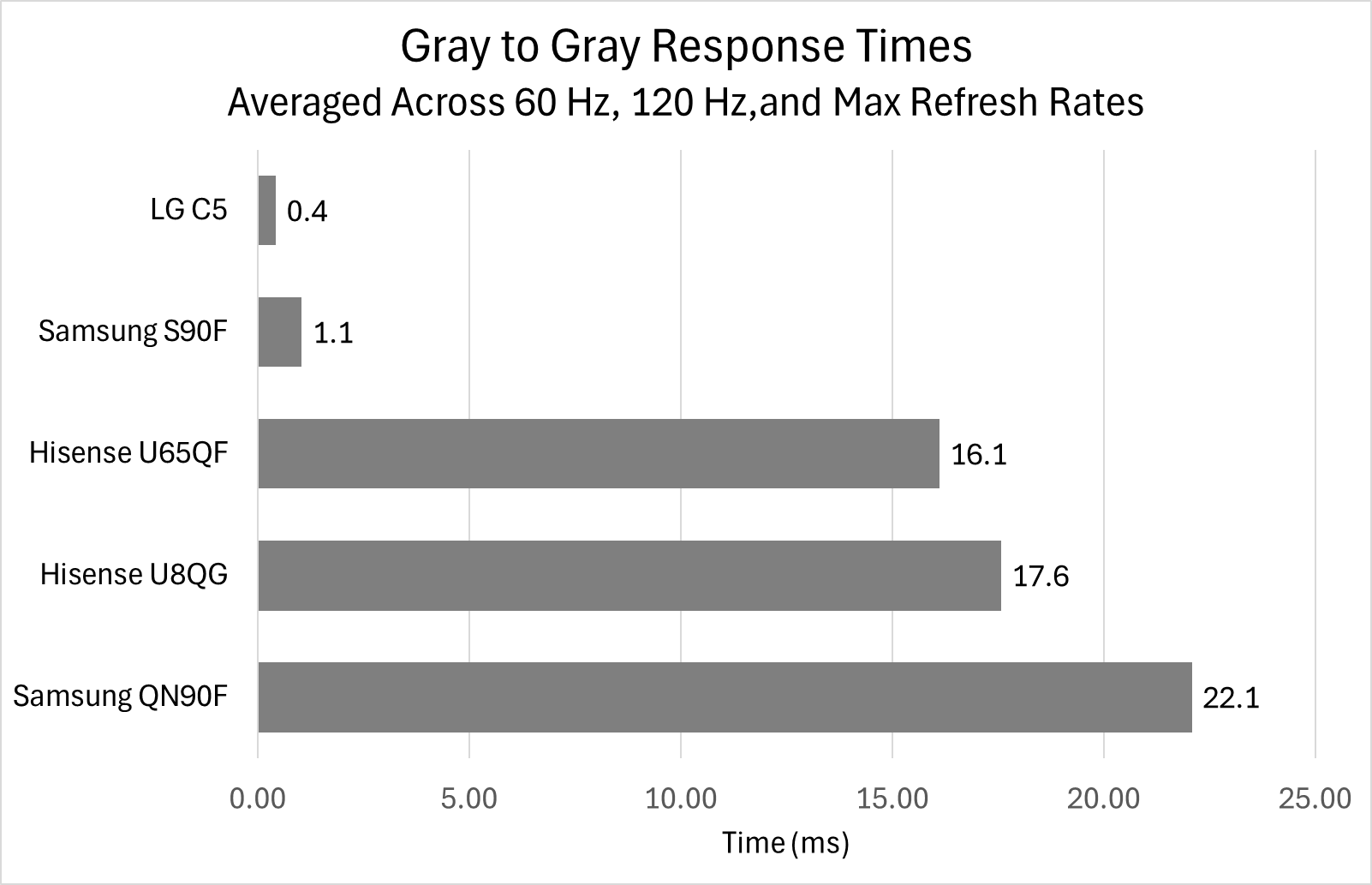 Response times for the C5 are basically perfect, topping the RT chart along with another OLED: Samsung’s S90F. Averaged across 60 Hz, 120 Hz, and the C5’s max of 144 Hz, I measured gamma-corrected response times at about 0.4 ms, but that comes from a few stragglers; most responses are faster than 200 microseconds. This means that the display is nearly a perfect sample-and-hold limited device, so the only way to reduce motion blur further is to increase refresh rates. A max refresh rate of 144 Hz is good, but I’d still like to see this being pushed out more. 240 Hz at 4K is something that remains limited to the best gaming monitors, as even the more expensive TV models (LG G5 or Samsung S95F) from both brands top out at 165 Hz.