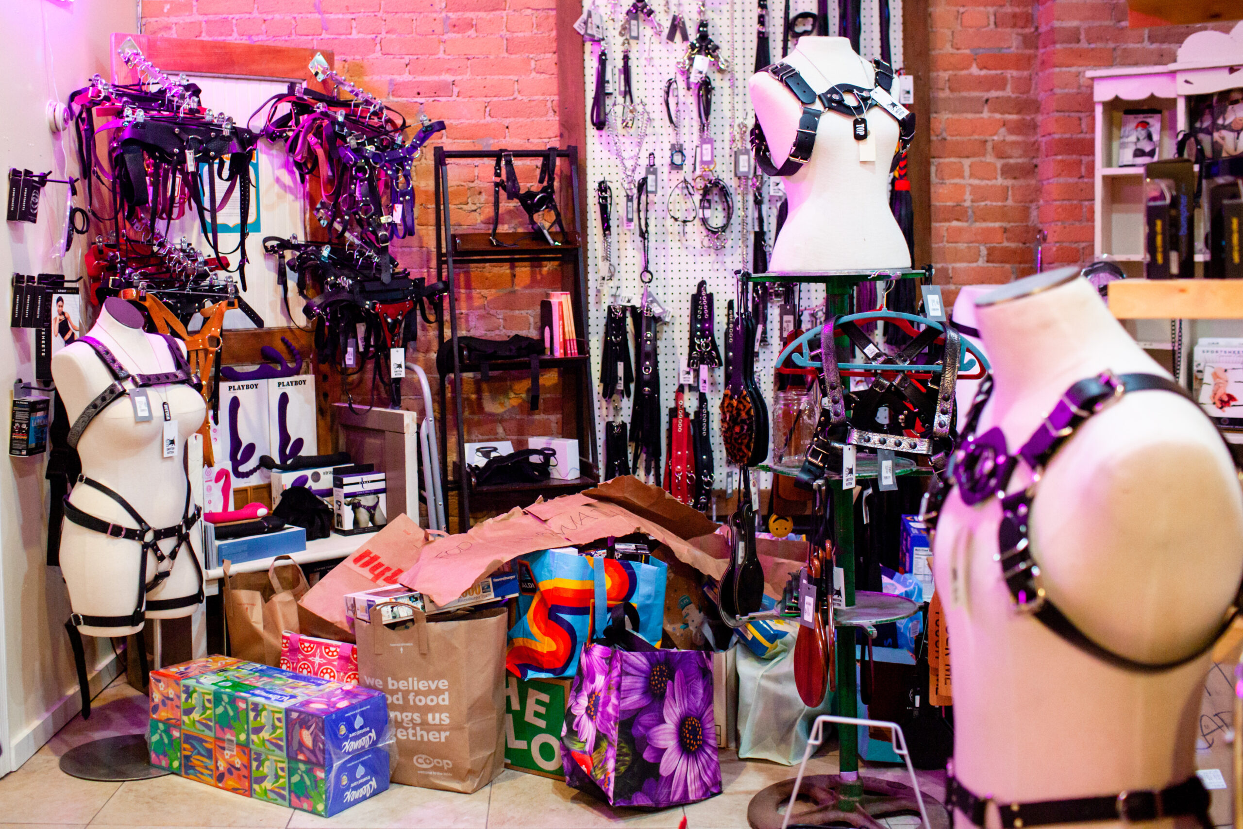 A trans-owned sex toy store in Minneapolis called Smitten Kitten has become one of the major distribution centers, with boxes of Kleenex and Kraft Mac and Cheese and Campbell’s soup piled up next to displays of leather harnesses and wooden paddles.