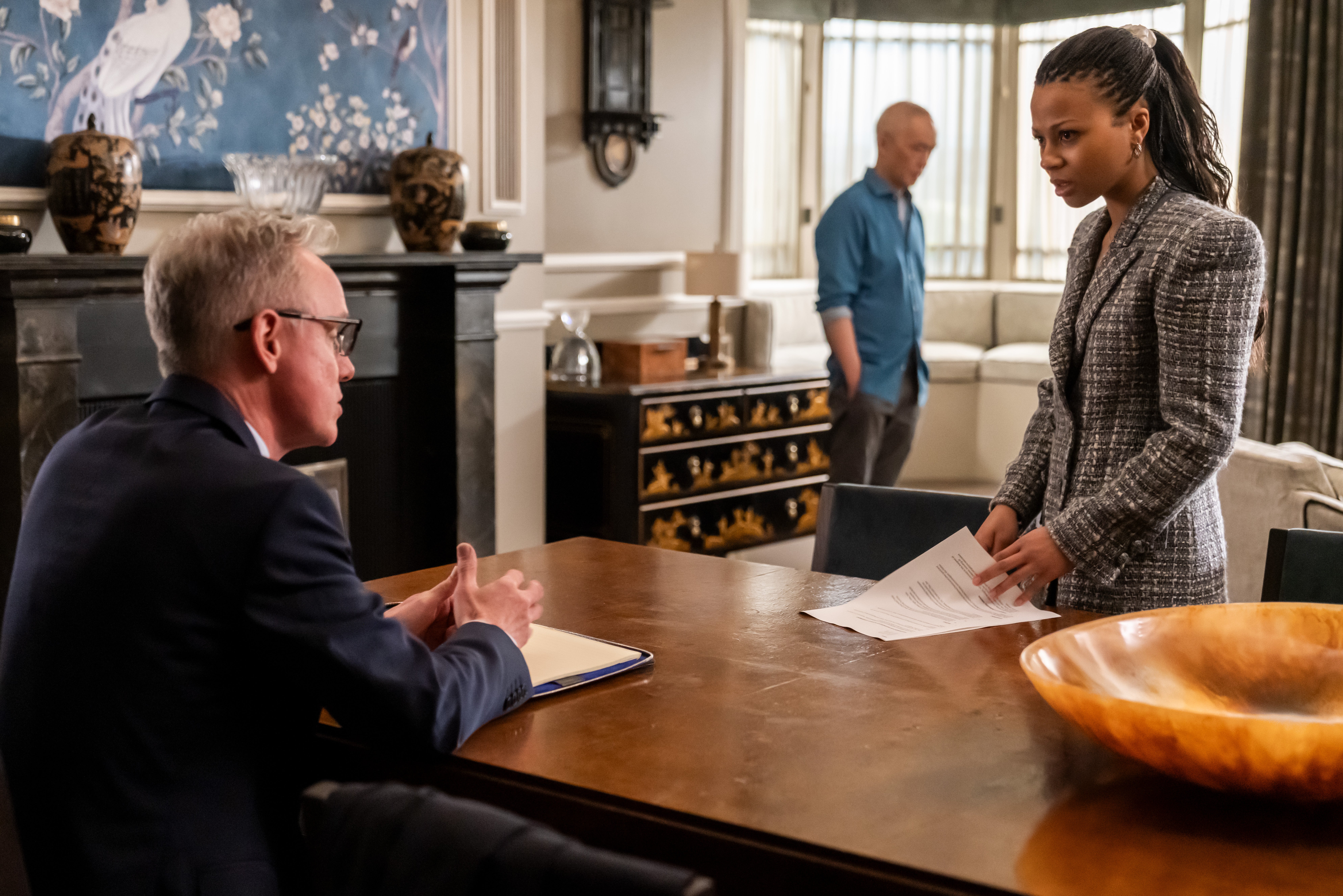Myha’la: I think Eric’s always been an idol of Harper’s. She comes in seeing a version of herself in him like, “This is what I could be.” And he feels like the only person who has the kind of volatile, dirty, scrappy energy towards finance, someone who will just support her, even if he’s not that way anymore. She’s like, “You get me. I know you’ll support me.” And when they don’t have the bank’s structure, then they can play out this pseudo-parental thingy without any prying eyes or [it being] an HR issue. But also, I think Harper is like, “Oh, it’s not like that. Let’s not go there explicitly because we know it’s happening, but let’s just not say it because the second we say [it], it’s going to ruin everything and we’re not going to be able to work together.” And she’s right. She turns out to be totally right.