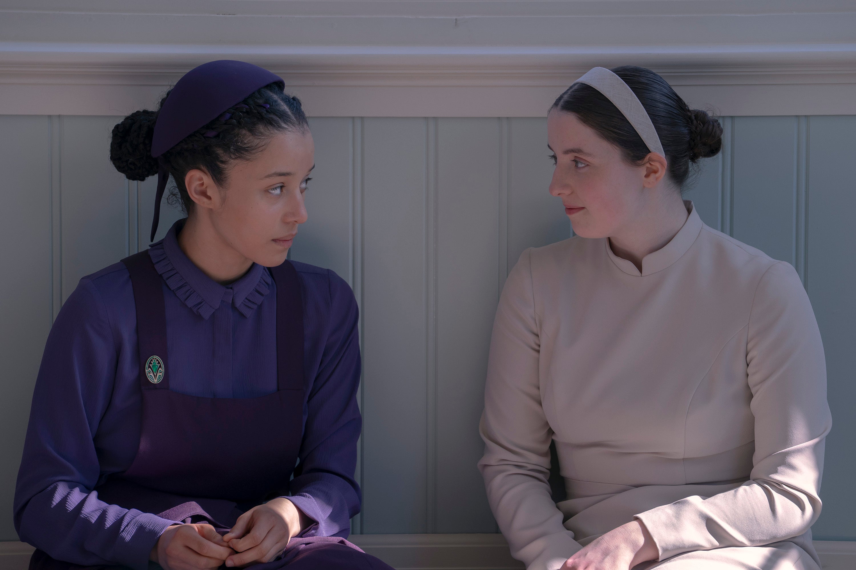 The second narrator is Daisy (Lucy Halliday), a Pearl girl managed by Aunt Lydia (Dowd, reprising her role) and her equally restrictive teachers. Always dressed in austere white outfits, she is one of the female teens from the outside world who were either recruited into Gilead or taken by force, then retrained to be “godly” servants. On the surface, Daisy acts like a pious recruit who is tasked by Lydia to get to know her fellow students, but she’s holding back secrets of her own that get revealed – thankfully – sooner than later.