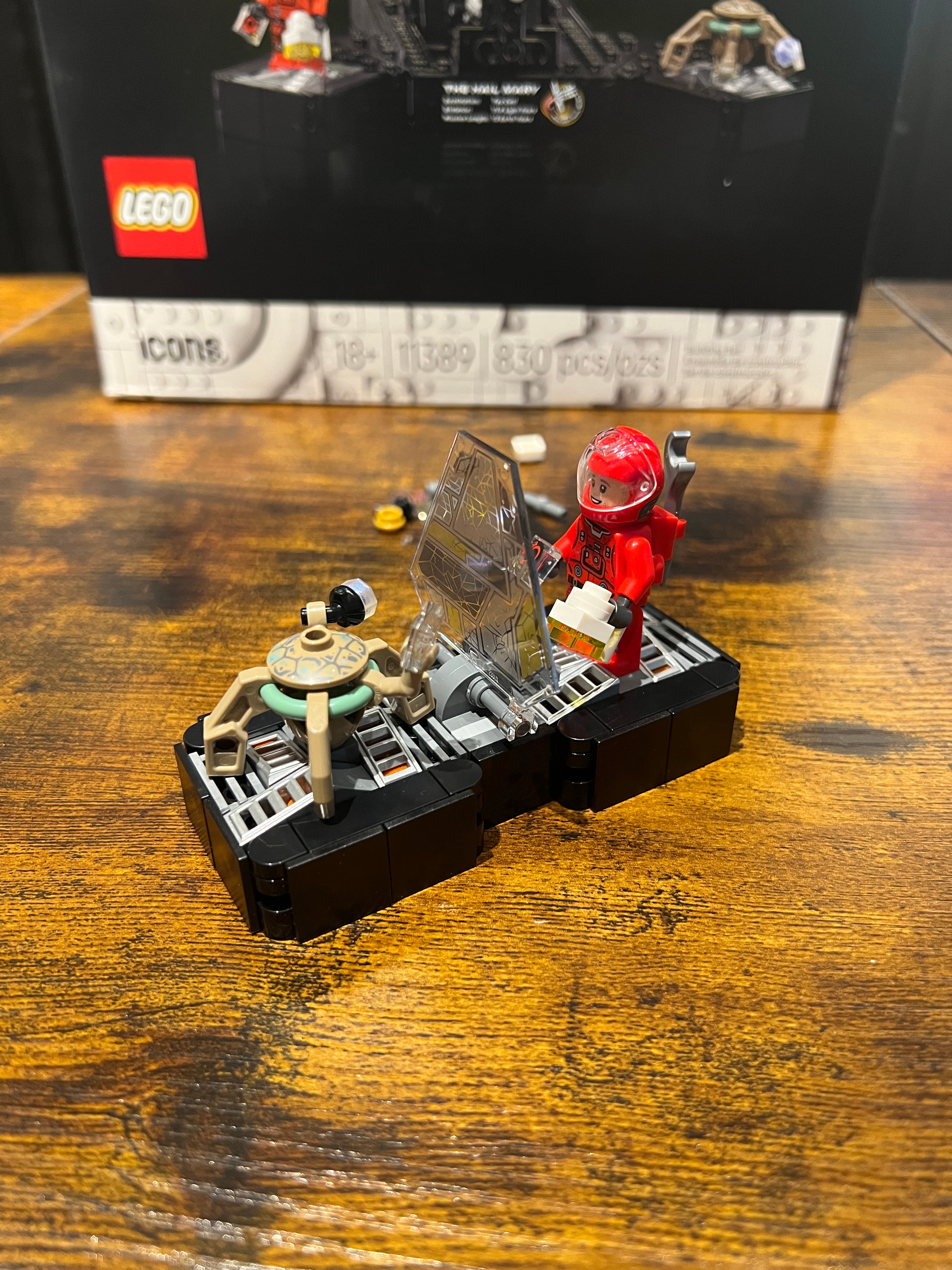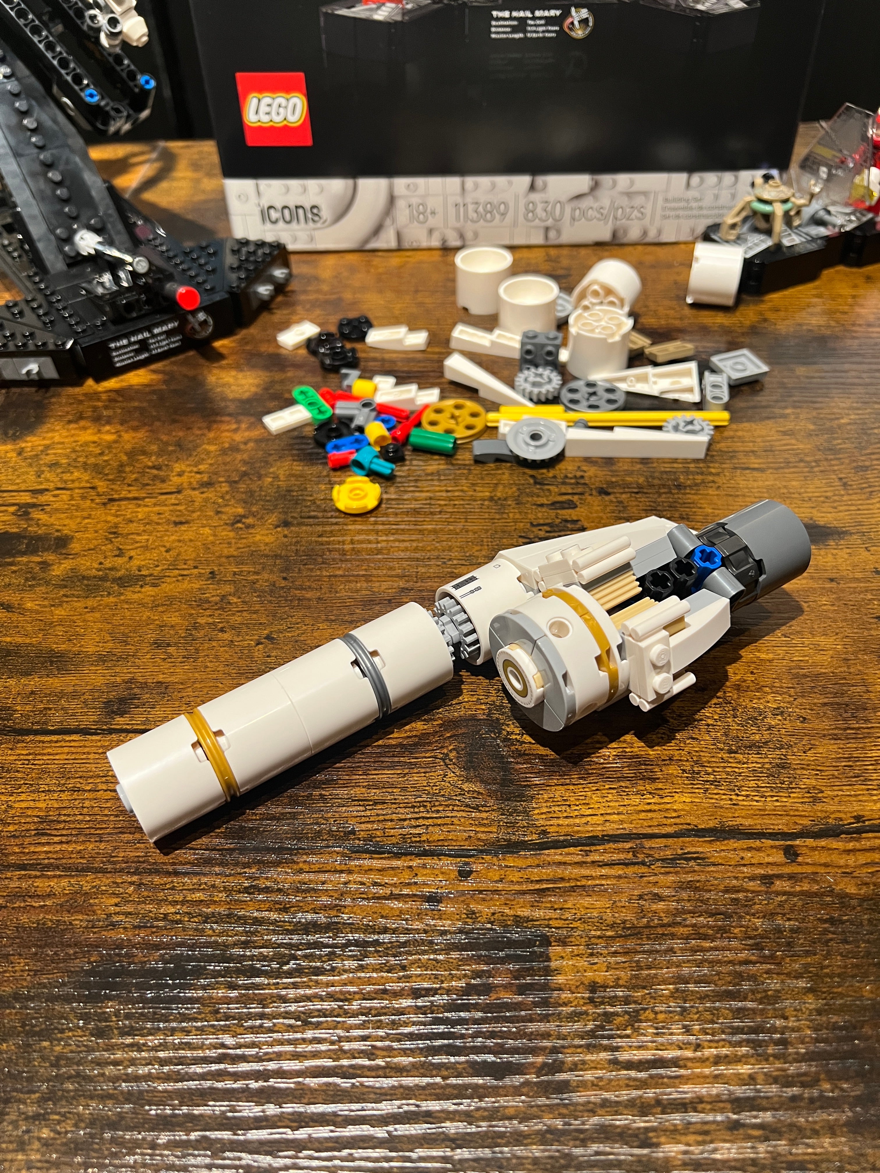 The ship itself is most made up of white cylindrical bricks and is a faithful recreation of what we see on screen. The Astrophage-powered engines are the biggest part of its structure, with the centrifuge in the middle. Assembling the ship also uses atypical attachment techniques, and I was in awe when putting it together during the back half of my time with it. For a set with under 1,000 pieces, it’s pretty impressive how much they were able to achieve here.