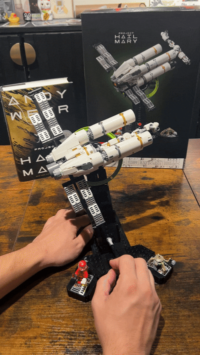 Upon first glance, I wouldn’t blame you if thought the Project Hail Mary set was just another static display piece like many other LEGO sets for adults. Sure, it comes with a detailed recreation of the Hail Mary spacecraft, vignettes of minifigures Grace and Rocky, a robust display stand, and marquee detailing the mission. But this build is so much more than that. To my surprise, the entire build is centered around attaching the ship onto a mechanical gear system, all brick-built, that’s attached to a crank at the base of the display stand. When you turn it, the ship starts to rotate, simulating the ship’s centrifugal gravity system like in the movie.