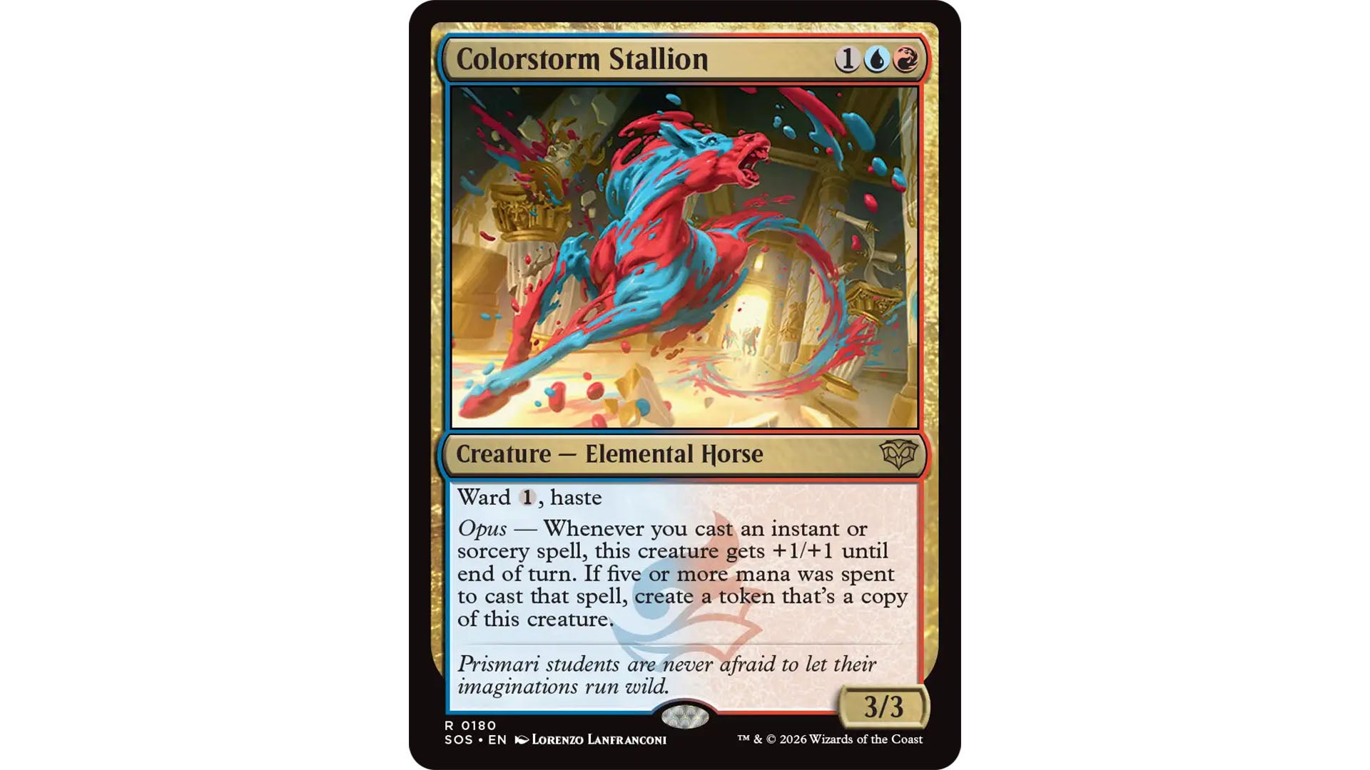 Opus (Prismari) – Cards like Colorstorm Stallion with the Opus keyword will gain +1/+1 counters until end of turn when instant and sorcery cards are played, with additional effects for larger spells.