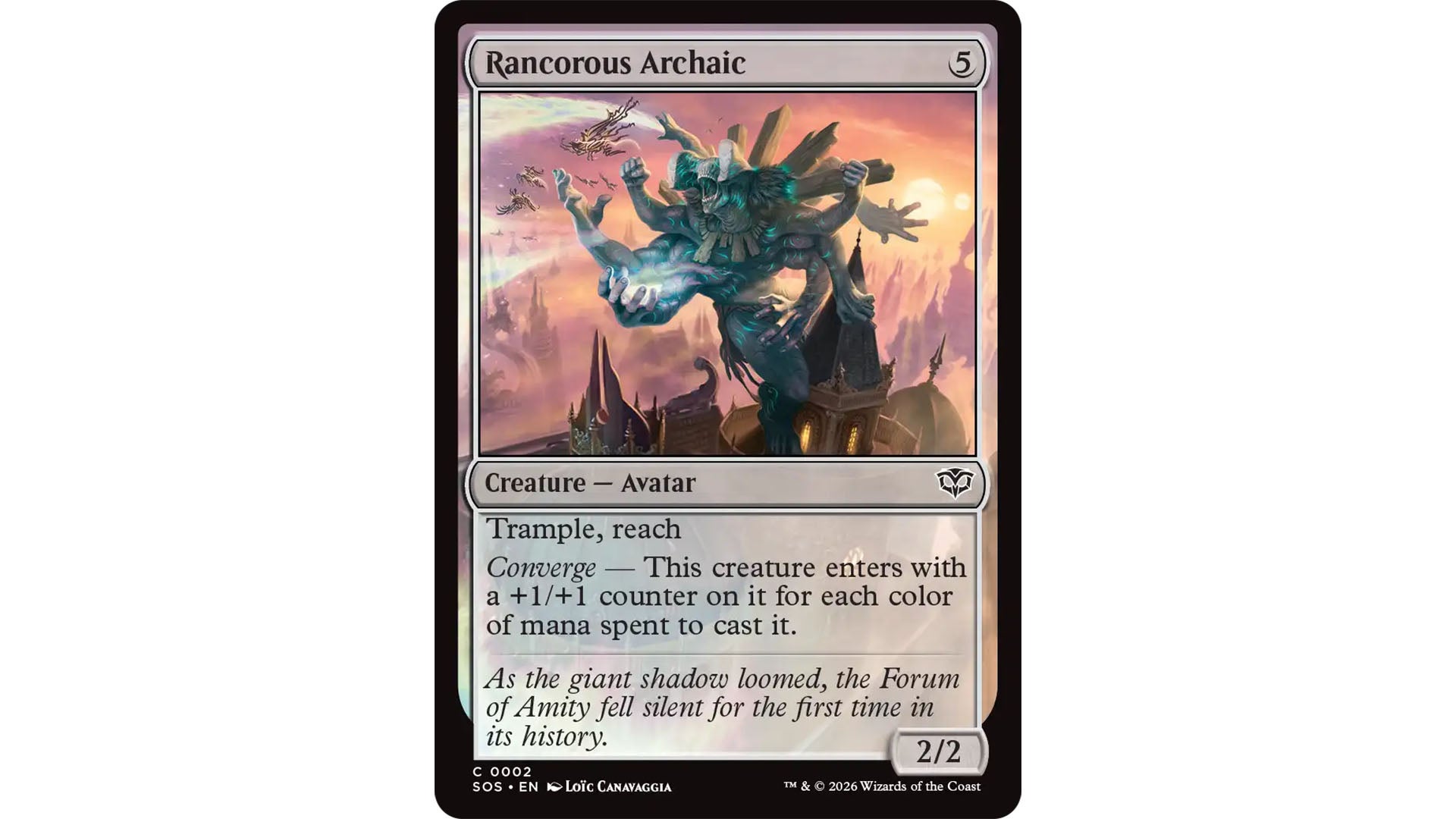 Rancorous Archaic, for example, is a five-cost card. Cast it with all red mana, and it’ll enter as a standard 3/3 with Trample and Reach thanks to a single +1/+1 counter. Spend all five colors, however, and it’ll enter as a 7/7 thanks to five of those counters;