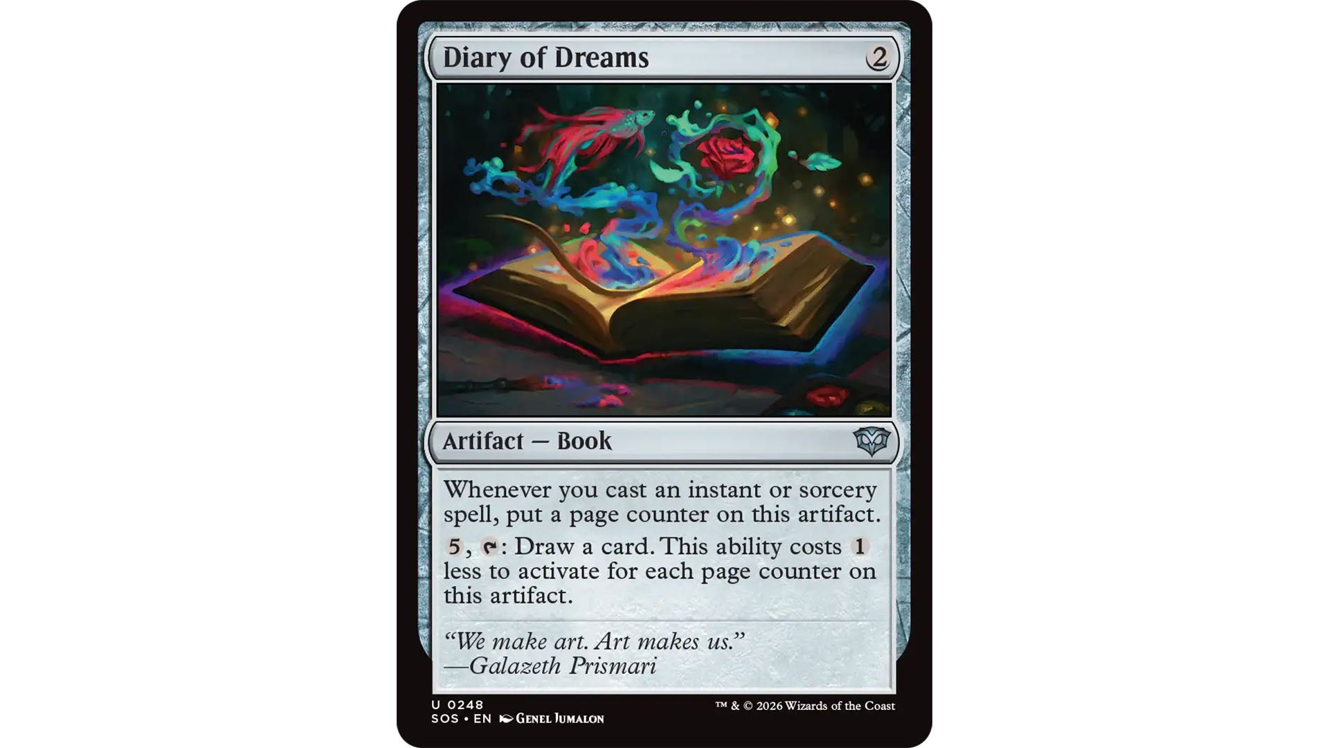Books, like Diary of Dreams, are a new Artifact type that gains page counters which can then be spent to trigger other effects.